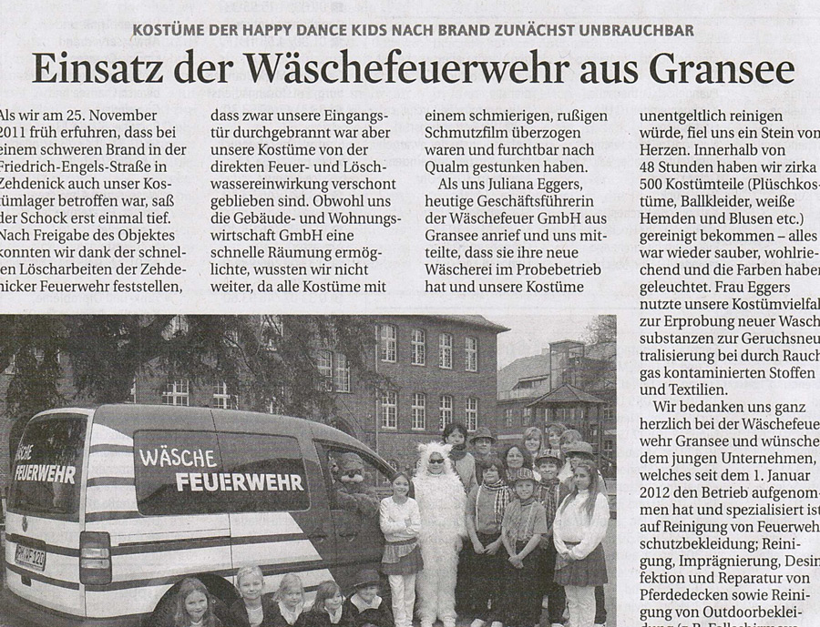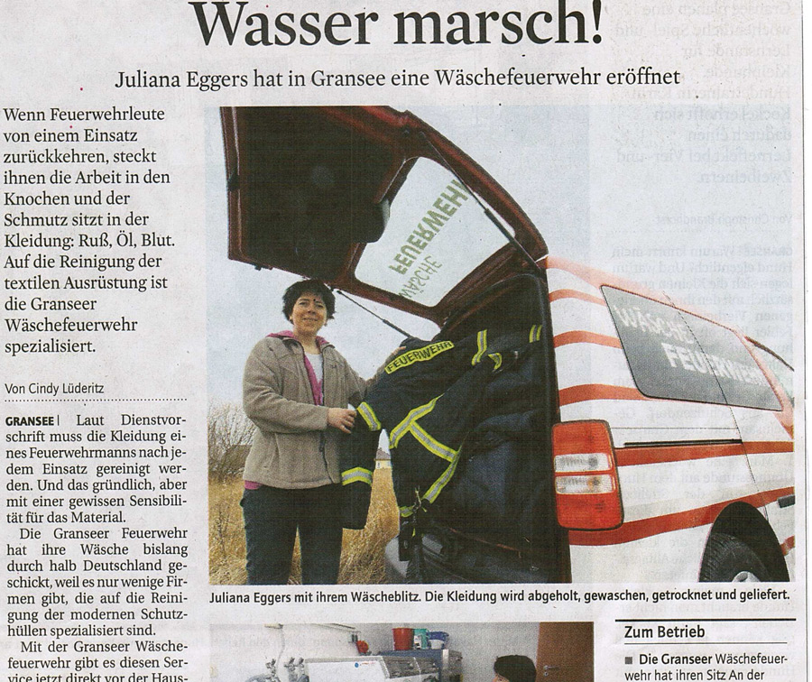 Die WäscheFeuerwehr ist 2009 von Juliana Eggers gegründet worden und wurde 2011 in eine GmbH umgewandelt. Die Spezialgebiete der WäscheFeuerwehr liegen im Waschen von Pferdedecken- und Zubehör, Feuerwehranzügen und Personenschutzausrüstung, sowie Fallschirmspringer Overalls.